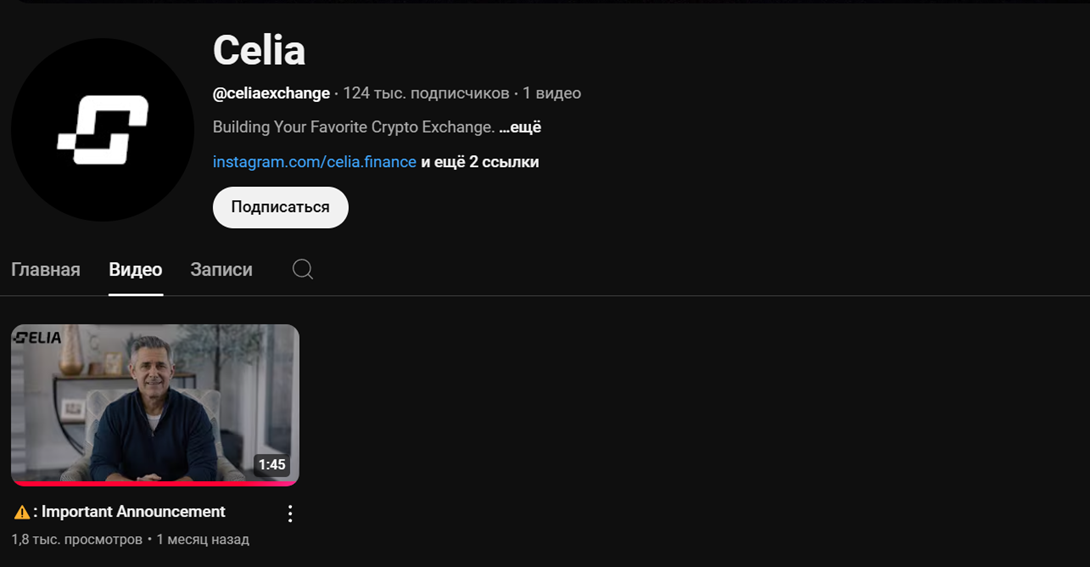 Официальная группа в Телеграме Celiaexchange имеет 328 подписчиков. Количество просмотров последних постов достигает 22-23 тысяч. Это говорит о больших накрутках аудитории ботами. Комментарии закрыты. Канал появился 15 сентября 2022 года, но первое сообщение, доступное на данный момент, опубликовано 12 апреля 2024 года. Активное ведение канала началось с 19 февраля 2025 года. Это говорит о вероятном выкупе другого канала и смене тематики. Предположение подтверждается стабильным падением количества просмотров Celiaexchangegroup с несколько сотен тысяч до нескольких десятков тысяч менее чем за 2 месяца.