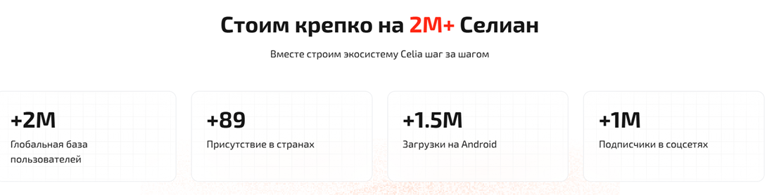 Разработчики утверждают, что token Celia является не просто криптовалютой, а целой сетью для игроков, создателей программ, пользователей и прочих лиц. Проект открыт для всех, поэтому и обладает высокими перспективами. На главной странице сайта Celia ltd указано, что глобальная база всех пользователей здесь составляет более 2 миллионов. Компания работает в 89 странах. 1,5 миллионов пользователей загрузили приложение на гаджеты с Android.