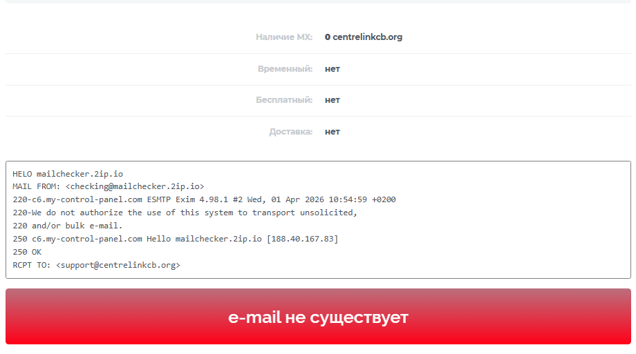- Почта клиентской службы не работает: отправлять письма на support @ centrelinkcb org бесполезно;
