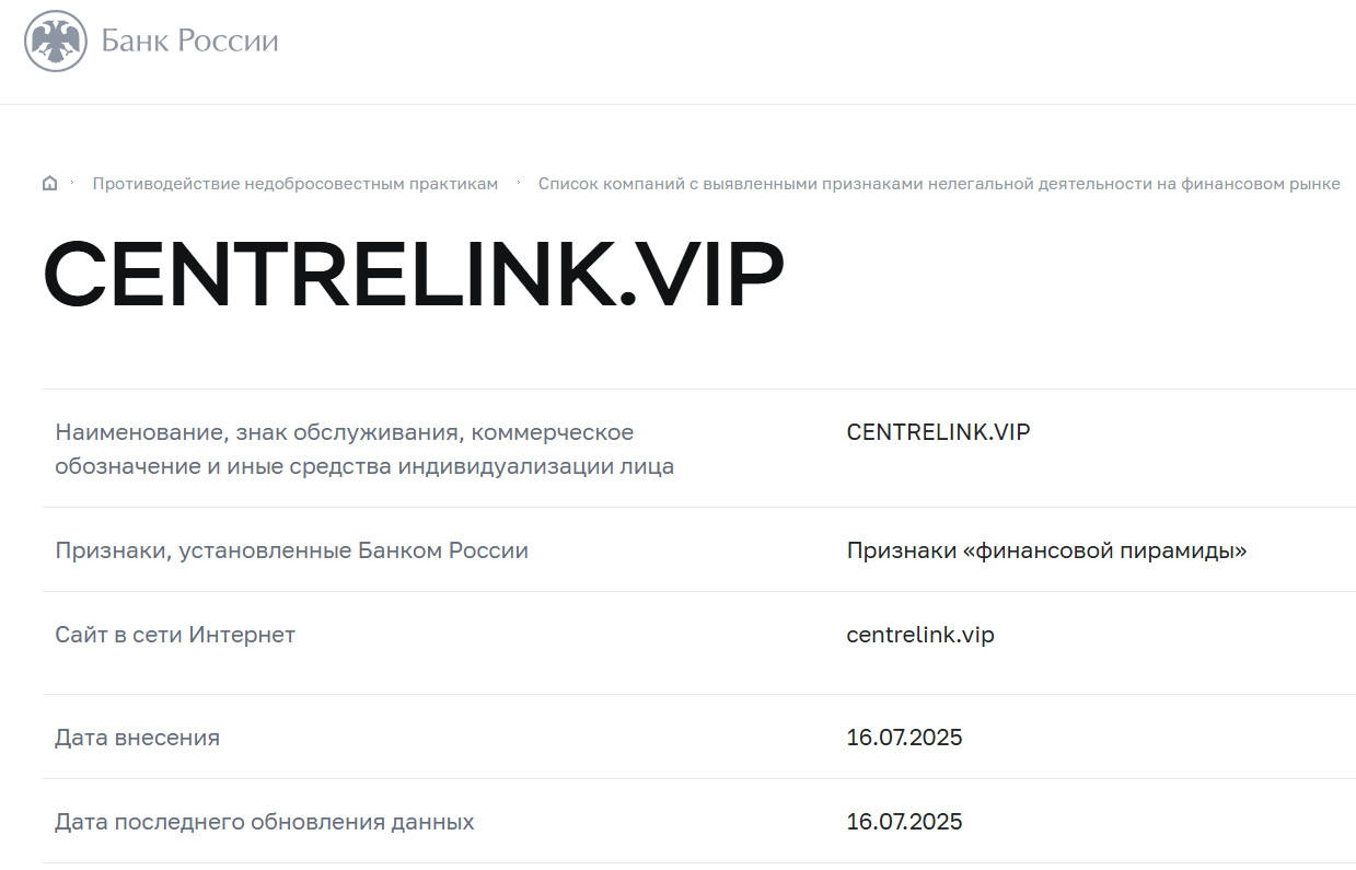 - Сайт с похожим именем Centrelink Vip внесен Банком России в список финансовых пирамид;