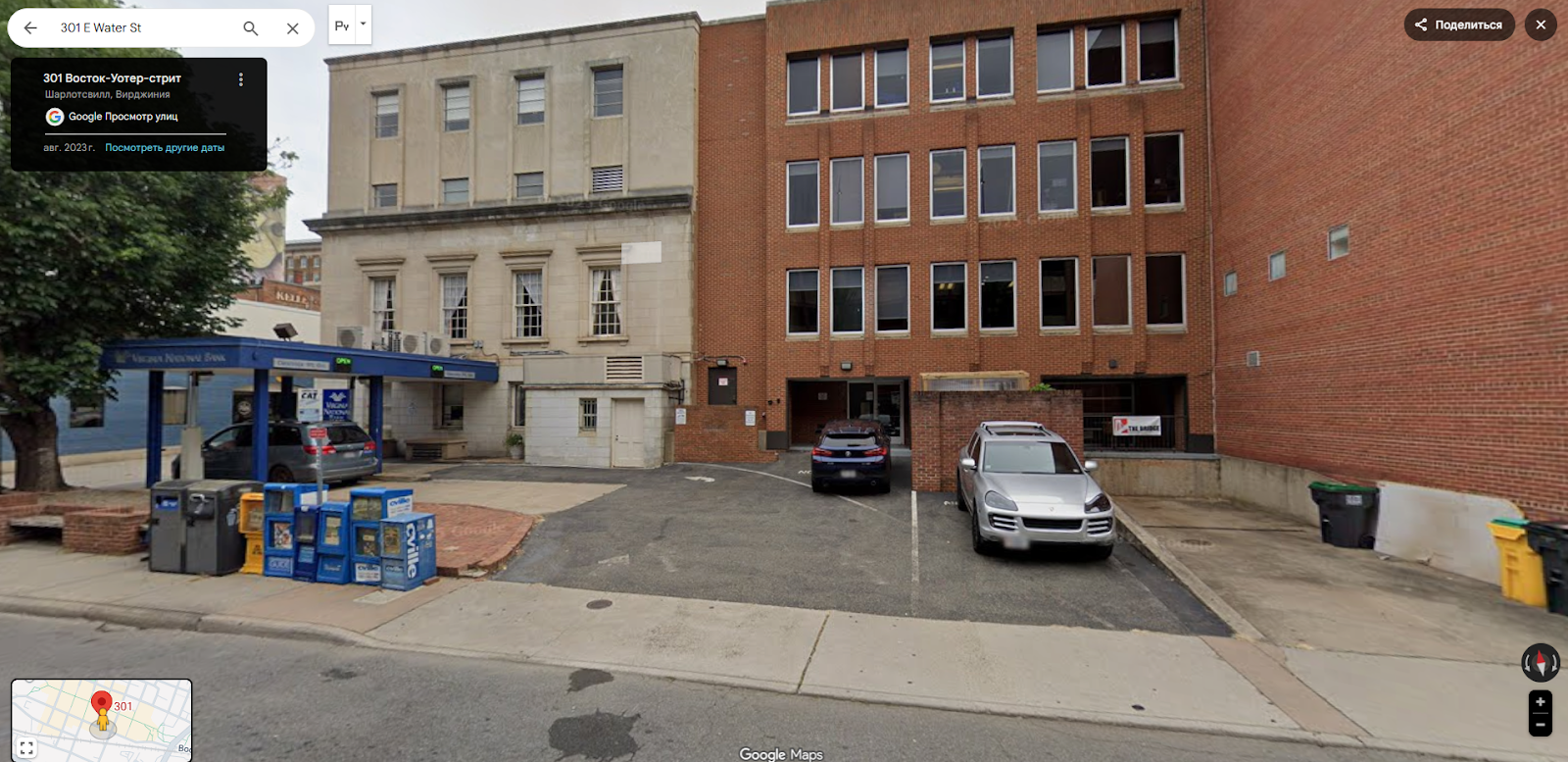 Еще один подозрительный момент — адрес офиса. На сайте указана локация в США: 301 East Water Street, Charlottesville, VA 22904 Virginia, но по адресу компаний с таким именем на картографических сервисах не значится.