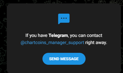 Клиентам предоставляется лишь один способ связи с технической поддержкой Chartcoins — через manager support. Контакты указаны на официальном сайте. При нажатии на вкладку «Поддержка» пользователь попадает в Телеграм-бот.