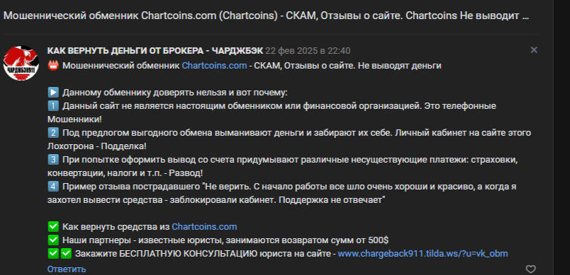 Администратор одного из ресурсов, связанных с обзором бирж и обменников, указал, что chartcoins com — это скам. Создатели постоянно меняют адрес сайта, чтобы заметать следы мошенничества.