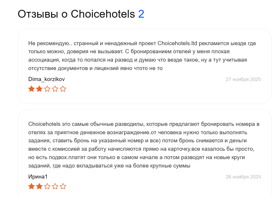 Choicehotels накопил множество негативных отзывов. Пользователи отмечают отсутствие прозрачности, проблемы с выводом средств и блокировку аккаунтов. Один из клиентов рассказывает, что Choicehotels – это развод, где участникам предлагают бронировать номера в отелях за вознаграждение, но платят только на старте. Затем сотрудники требуют вложений в новые задания на крупные суммы. После этого выплаты прекращаются полностью.
