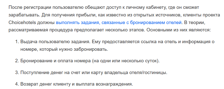 Choicehotels предлагает заработок на выполнении заданий, которые связаны с бронированием номеров в отелях. После регистрации по инвайт-коду клиент попадает в личный кабинет, где ему начинают выдавать задания. Каждое задание содержит ссылку на отель и точные данные, такие как название, даты и тип номера.