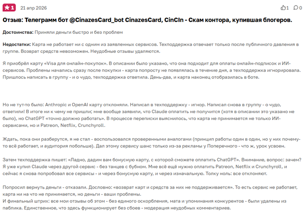 В апреле 2026 года в Сети есть только один отзыв о картах от «Чиназес». Пользователь, который заказа услугу, оказался крайне недоволен. Он написал, что у него без проблем приняли деньги, выпустили карту, но она оказалась совсем нерабочей – ни один из сервисов не принял ее для оплаты. Человек попросил поддержку вернуть ему деньги, на что ему ответили, что такая опция здесь не предусмотрена.