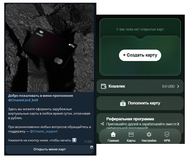 Чтобы заказать карту, клиенту нужно перейти в бота проекта, который размещается в Телеграмм. Там все работает через мини-приложение, не требующее отдельной установки. Клиентов не просят предоставлять документы, а карту обещают оформить меньше, чем за минуту. В боте от Cinazes Card достаточно кликнуть на кнопку «+Создать карту», чтобы вскоре получить виртуальный платежный инструмент. У одного клиента может быть несколько карт, следить за которыми предлагают в том же приложении.