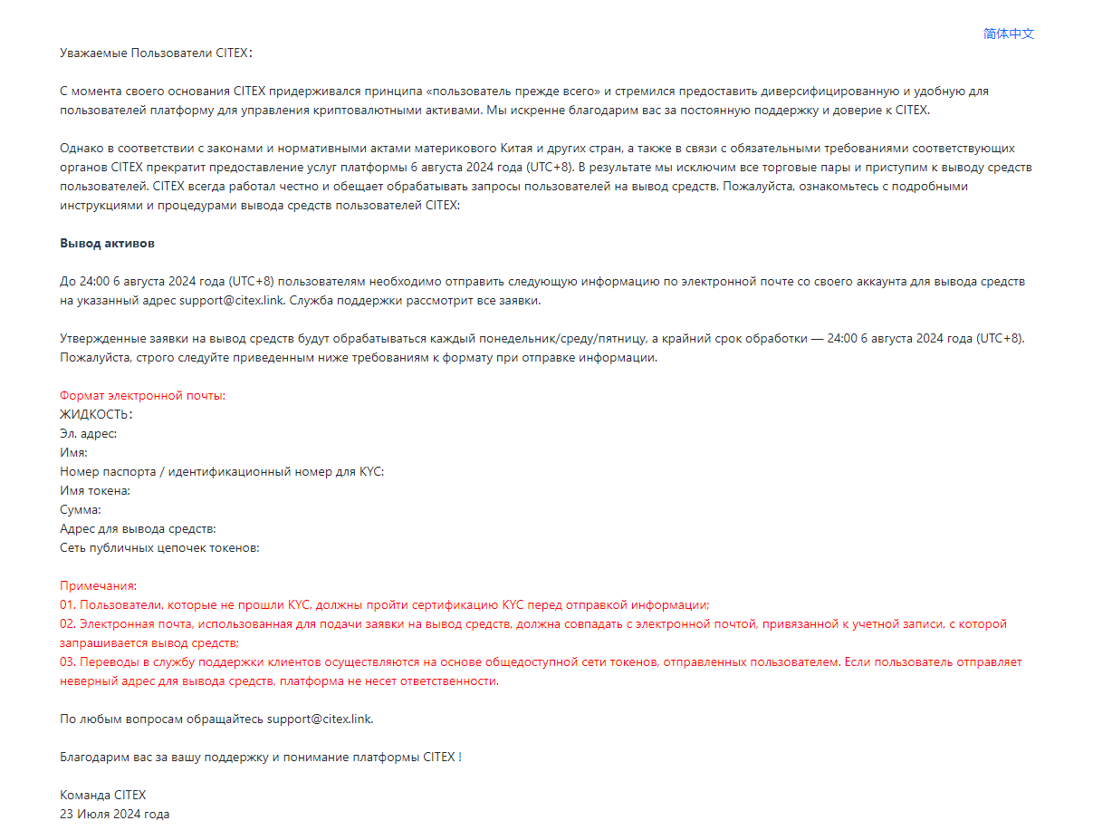 В последнем сообщении, размещенном на официальном сайте, было указано как вывести средства с биржи Citex.
