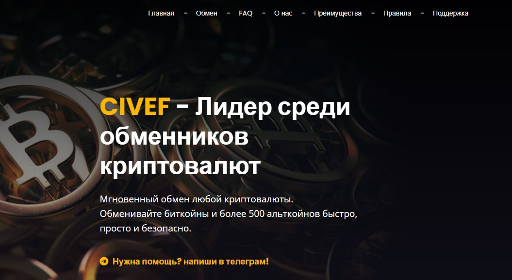 Civef com — обменник криптовалют, позиционируется как лидер в своей отрасли. Пользователям обещают поддержку сотен монет и мгновенную скорость проведения операций. Проверим, насколько чисто работает этот сервис и стоит ли использовать его для обмена.