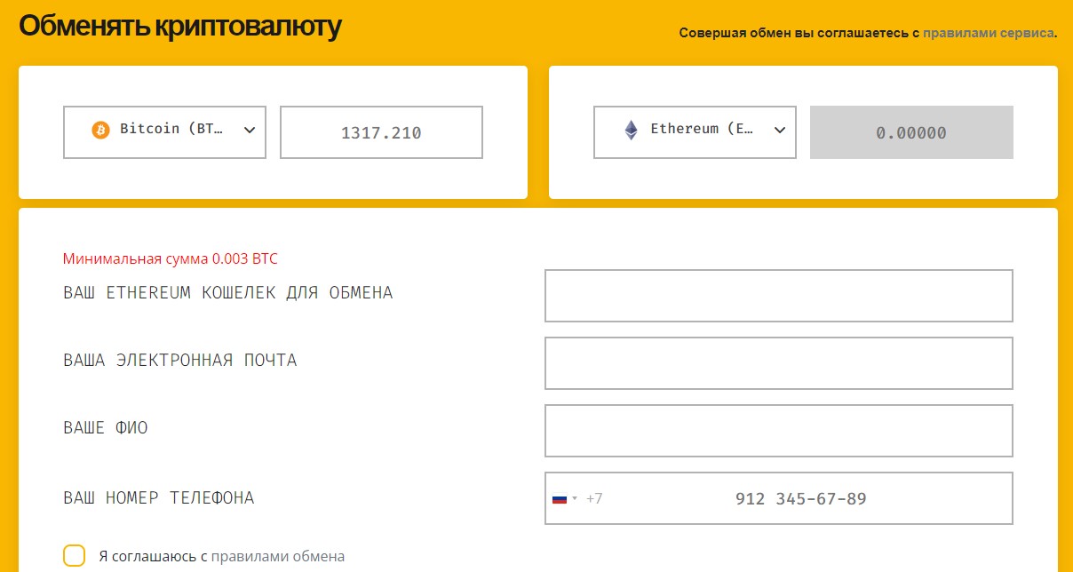 Работает обменник только в формате сайта, на котором есть форма обмена. Для операции, кроме суммы и направления, нужно указывать фамилию, имя и телефон. В соцсетях у Civef нет сообществ, для обратной связи оставили только контакт админа в Телеграме.