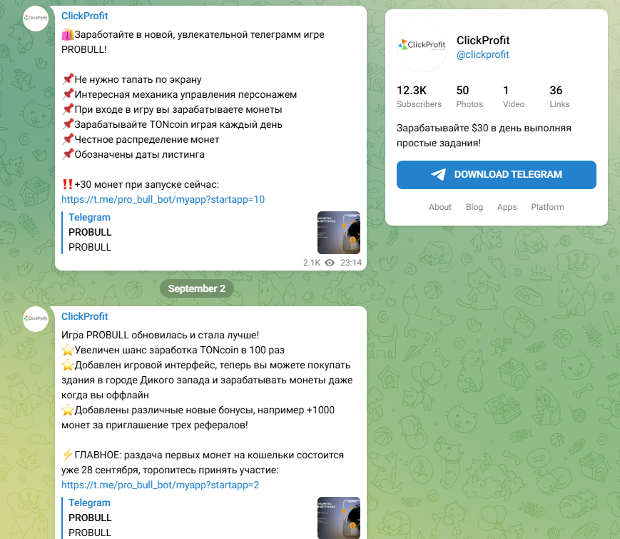 - На Телеграмм Click Profit подписано более 12000 человек. Посты дублируют контент канала gitarget и выходят с задержкой в 1-2 часа.