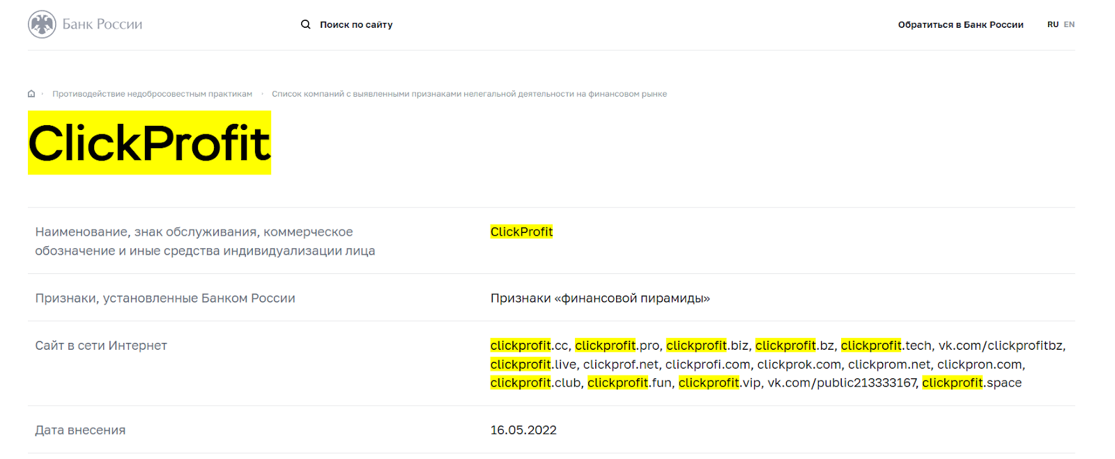 Clickprofit — банальная финансовая пирамида под видом букса. Выплат не совершали даже на ранних этапах. С 2022 года внесены в черный список российского регулятора, сайты блокируются Роскомнадзором. Нет сведений, что в настоящее время лохотрон активен. Минусы: