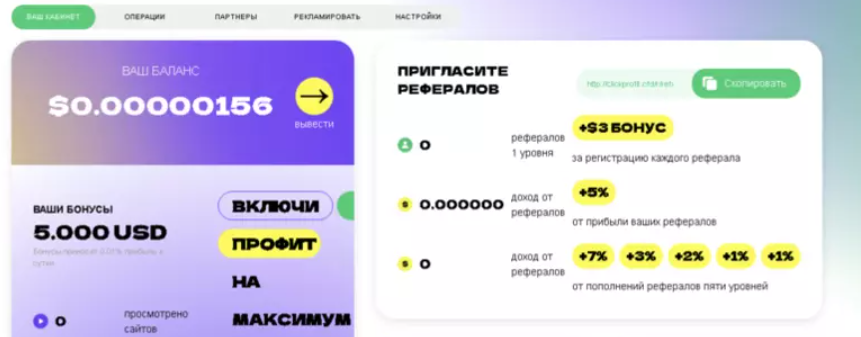 При регистрации в КликПрофит пользователь получает на счет 5 долларов. Вывести их нельзя, придется сначала вложить средства в проект, но с инвестиций обещают пассивный доход 2,5%. За каждый рекламный переход клиент платформы получает копейки — 0,0004$. Накопить на вывод средств только просмотром контента почти нереально. Но компания готова щедро платить участникам реферальной программы: