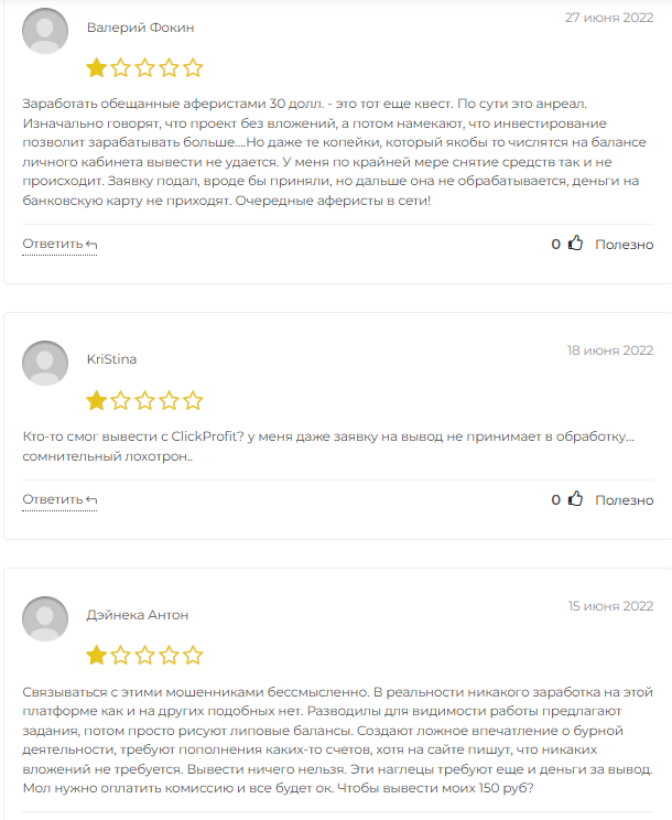 В сети много негативных отзывов о Телеграмм Клик Профит. Пользователи пишут, что заработать обещанные в рекламе 30 долларов на сайте не так-то просто, а вывести — невозможно. Сначала требуется вложить средства, чтобы начать зарабатывать. Потом еще раз инвестировать, чтобы открыть вывод. Но в результате клиент получает финансовые и временные убытки.