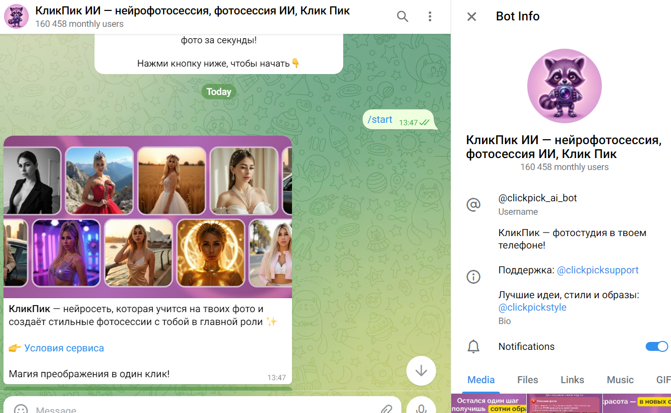 Clickpick ai bot — это тг-бот, который предназначен для создания различных фотографий с использованием ИИ. Пользователям нужно просто загрузить свои снимки и задавать параметры, и, по словам основателей, программа быстро предоставит качественную генерацию, а также сможет оживить фото. Далее мы расскажем о деятельности проекта и условиях работы с сервисом в деталях.