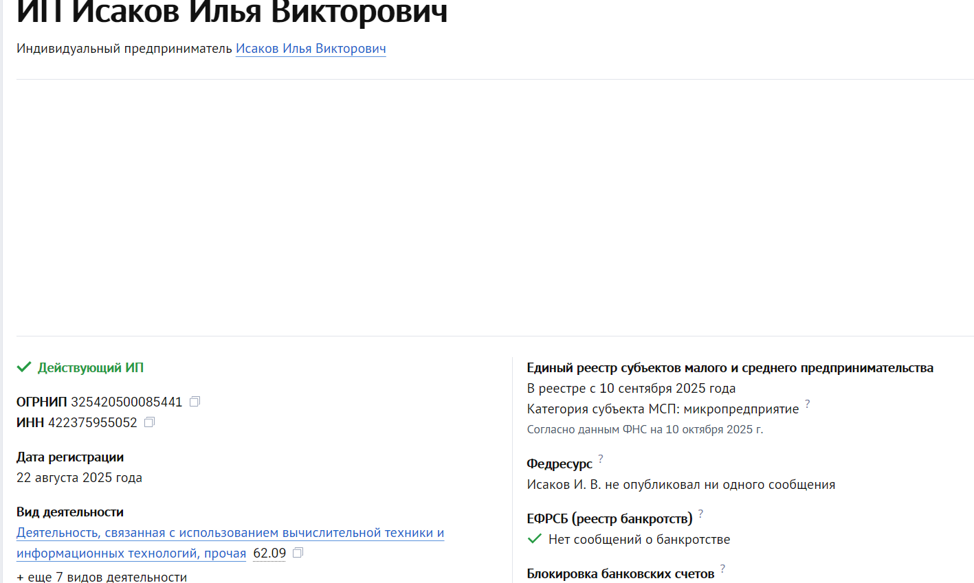 По оставленному номеру ИНН и ОГРНИП числится данный предприниматель, и он специализируется в сфере информационных технологий, программных продуктов, веб-порталов и прочих. В документе сказано, что сервис не несет ответственность за перебои в работе Телеграмма и платежных систем, а также за инфраструктуру генерации.