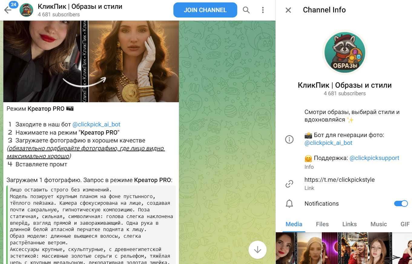Tg-канал КликПик Образы и Стили работает с мая 2025 года, и здесь 4.6k фолловеров.