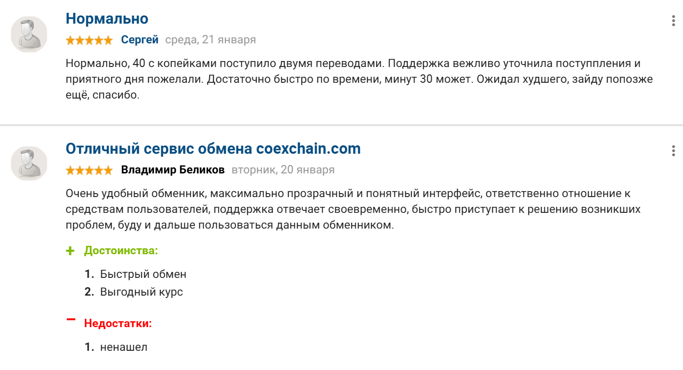В сети об этом обменнике нет информации. Мы нашли всего два отзыва о платформе coexchain com. Оба положительные. Насколько они честные, сказать сложно. Настораживает, что люди, которые их написали, зарегистрировались на платформе с отзывами в этот же день и больше туда не заходили.
