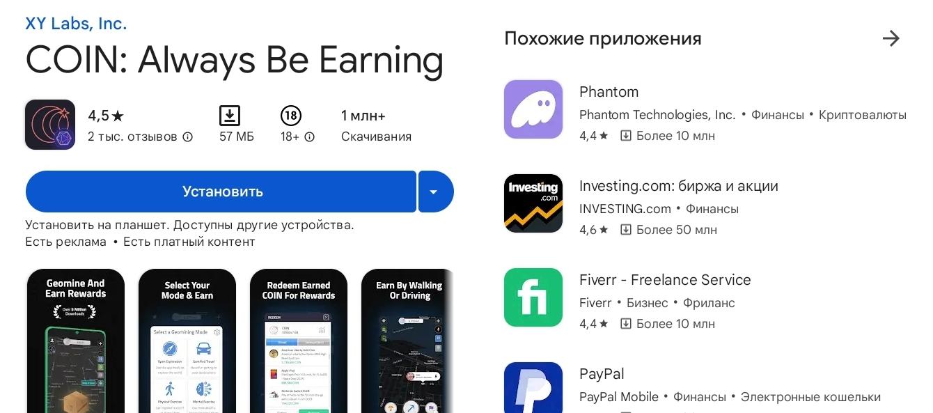 На сайте coinapp.co предлагают установить приложение на смартфон и делиться своей геолокацией за вознаграждение. Как заявляют разработчики, местоположение роли не играет, зарабатывать можно в любой точке мира, где есть интернет и GPS. Приложение доступно в Google Play и Apple Store. Количество установок превышает миллион, если учитывать данные Google Play.