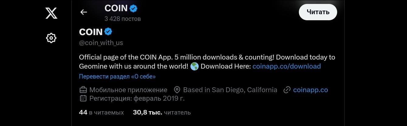 У компании есть группы в нескольких социальных сетях: Instagram (https://www.instagram.com/coinappcrypto), Facebook (https://www.facebook.com/coinwithus), X (https://x.com/coin_with_us) и Reddit (https://www.reddit.com/r/CoinWithUs/). Все каналы зарегистрированы в 2019 году. Посты в Twitter читают больше 30 000 человек.
