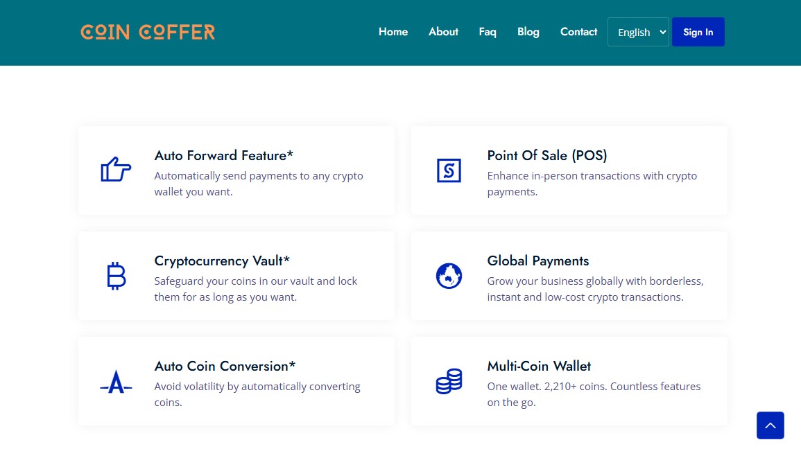 Платежный сервис Coin Coffer преподносится как удобный и мощный кошелек для работы с криптовалютой. Он предназначен для безопасного хранения активов. С его помощью можно покупать и продавать токены. Также есть функция глобальных переводов. На сайте присутствует контактная информация. Опубликован адрес 1205 Tipu Sultan Road, Motijheel в Бангладеш. Однако в условиях обслуживания указана компания Coin Coffer USA Inc из Америки. Среди заявленных преимуществ проекта: