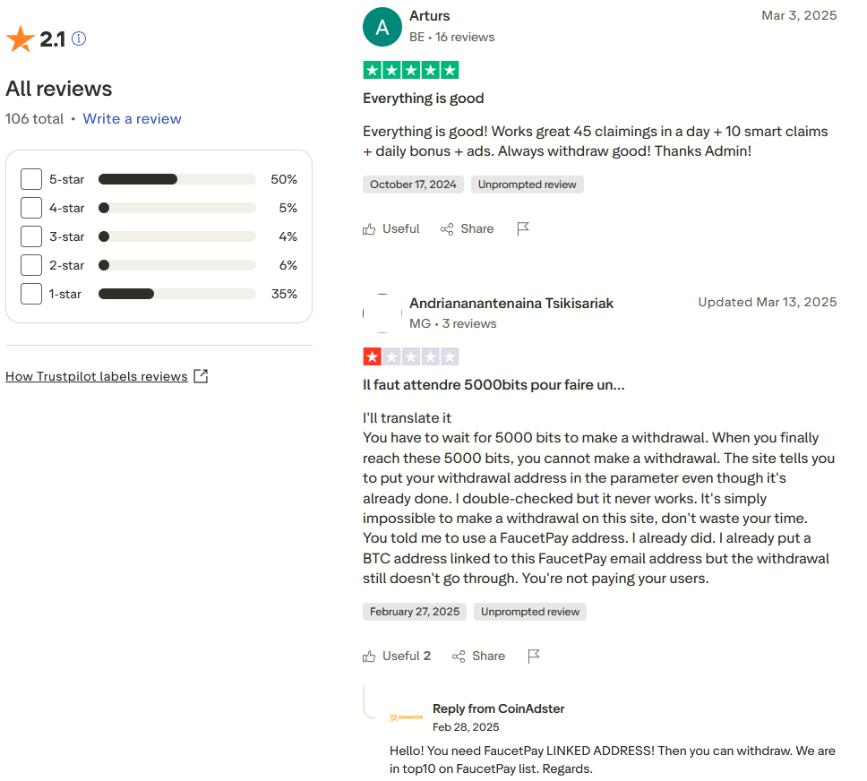 Отзывы про CoinAdster Com смешанные. На TrustPilot у онлайн-сервиса 106 оценок с общим рейтингом 2,1 балла из 5. С одной стороны, люди подтверждают, что здесь действительно платят.