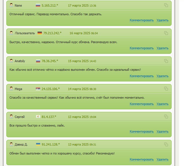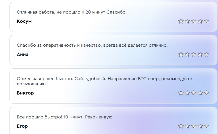 Большое количество отзывов есть на BestChange. Там более 2,5 тыс. позитивных откликов. Клиенты отмечают хороший курс, скорость обмена, качество обслуживания.