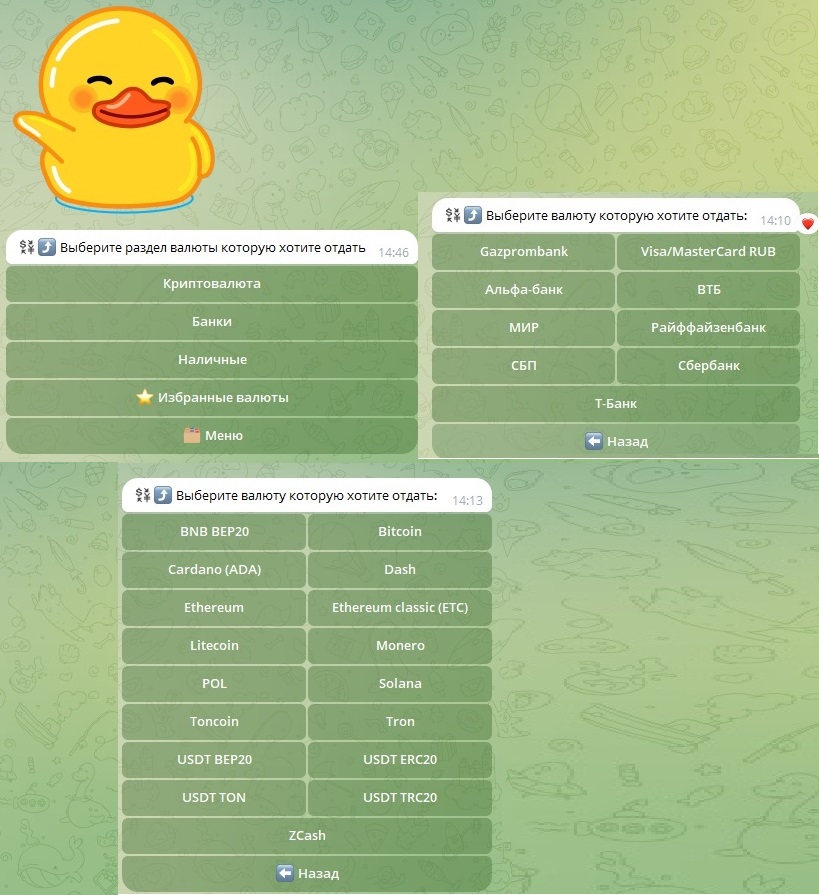В обменнике доступно 16 видов криптовалют и 4 фиатных — рубль, турецкая лира, доллар и евро. Переводы можно делать с помощью карт Виза/Мастеркард или через банковские счета (Газпромбанк, ВТБ, Райффайзен, Альфа-банк, Мир, СПБ, Сбер).