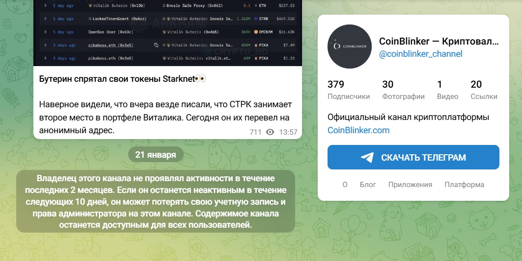 В качестве информресурса владельцы CoinBlinker используют блог в Телеграмм @coinblinker channel. Но последние новости там размещали еще в сентябре 2024 года и администрация мессенджера вынесла предупреждение о потери доступа к учетной записи.