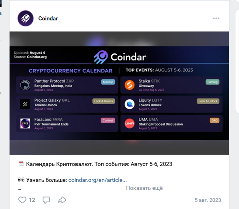 Coindar – новостной канал, который предлагает календарь событий в мире криптовалют. Информация публикуется на сайте coindar org и в Телеграм канале, на других источниках деятельность проекта постепенно останавливается.