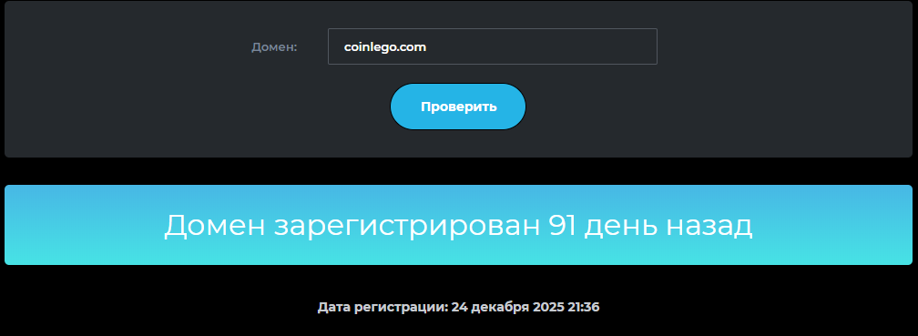 Серьезным аргументом в пользу отказа от взаимодействия с CoinLego Com может стать его малый возраст. Оказалось, что домен существует всего 3 месяца, а это очень мало, если еще и учитывать остальные проблемы проекта.