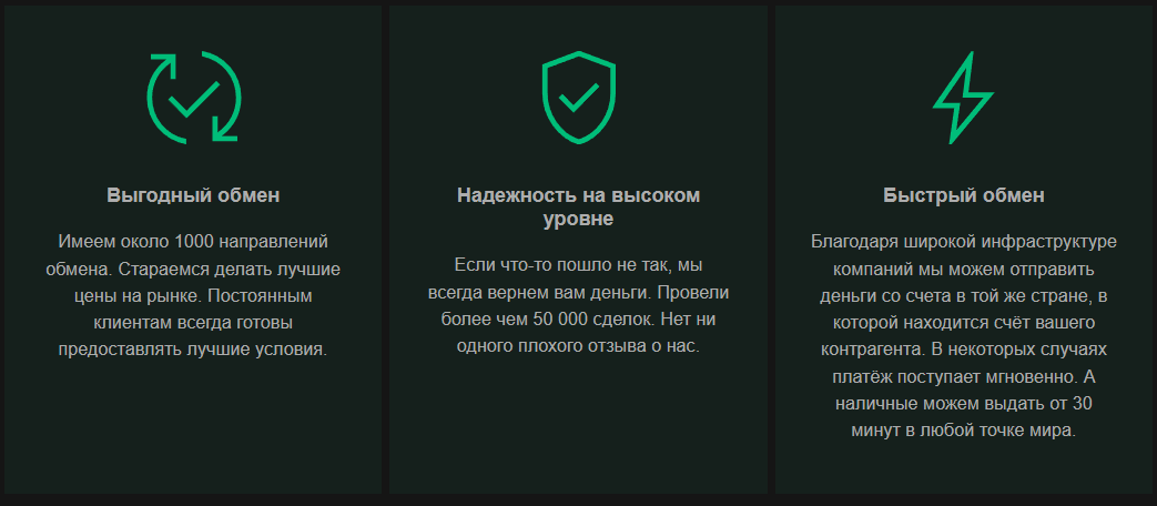 Информации на сайте очень мало. Есть один абстрактный текст о том, что сервис предлагает самые выгодные курсы, хотя это не так. Также перечислены типичные преимущества вроде безопасности, скорости и т.п. Вот только здесь содержится явная ложь. Так, разработчики утверждают, что предлагают более 1000 направлений обмена, хотя это совершенно не так: в реальности их лишь несколько сотен.