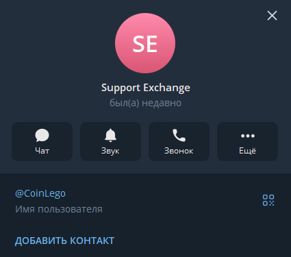 Связаться с поддержкой можно через электронную почту Info CoinLego Com или аккаунт поддержки в Telegram. Первый вариант неудобный и медленный, но и со вторым все непросто. Профиль оператора выглядит слишком подозрительно: на аватарке даже нет логотипа платформы, описание отсутствует, график работы не указан, а время последнего визита скрыто.