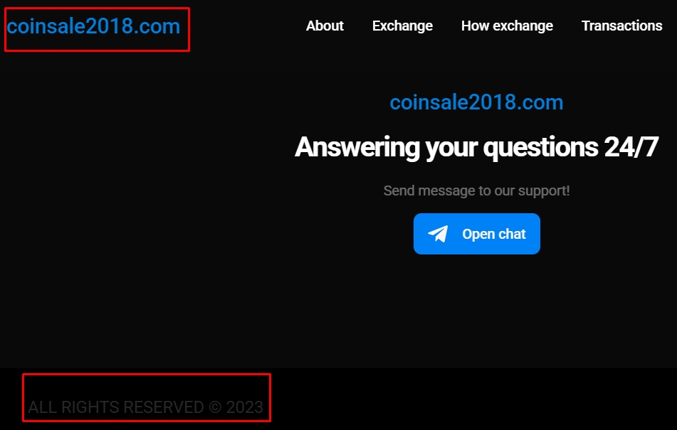 Информация о платформе валютника Coinsale2018 com представлена исключительно на английском языке, техподдержка – только Телеграмм аккаунтом Support Exchanger (@ exchangs support). На одностраничнике нет юридического адреса, номера регистрации конторы, названия финансового регулятора, не говоря уже о руководителях и номере телефона.