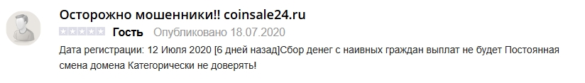 Рассмотрев деятельность Coinsale2018 мы не нашли никаких юридических данных – сотрудничая с валютником, пользователь с таким же успехом может отправить свои средства на частные кошельки неизвестных лиц. На положительную репутацию площадки трудятся проплаченные копирайтеры, однако один за другим совершают ошибки – мы же нашли настоящие мнения тех, кто воспользовался услугами на сайтах-копиях и попал в финансовый капкан.