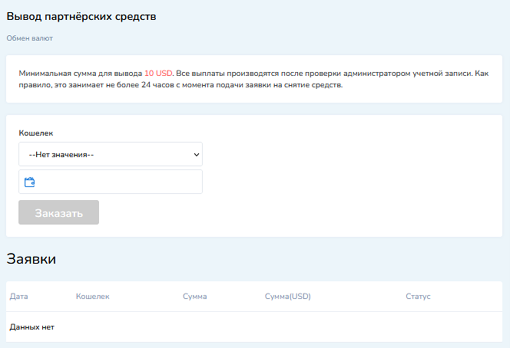 Вариантов пассивного заработка несколько. Это реферальные программы, скидки и бонусы для постоянных клиентов, рекламные материалы.Полученные средства можно вывести через отдельную форму. Минимальная сумма заявки составляет 10 у.е., переводы осуществляются только после проверки администратором. Сроки – до 24 часов. Статус заявки можно увидеть в разделе с выводом партнерских средств.
