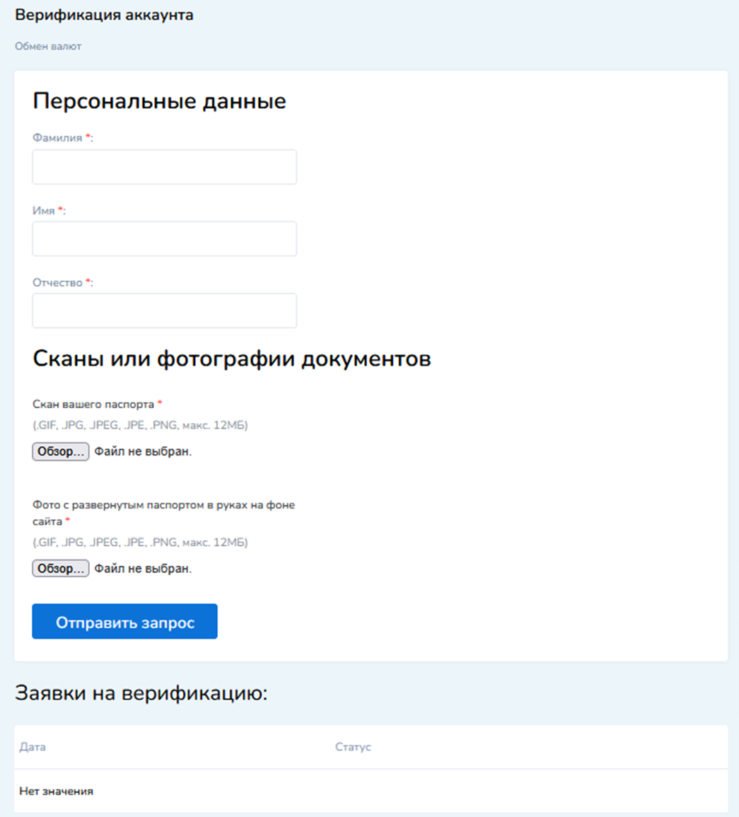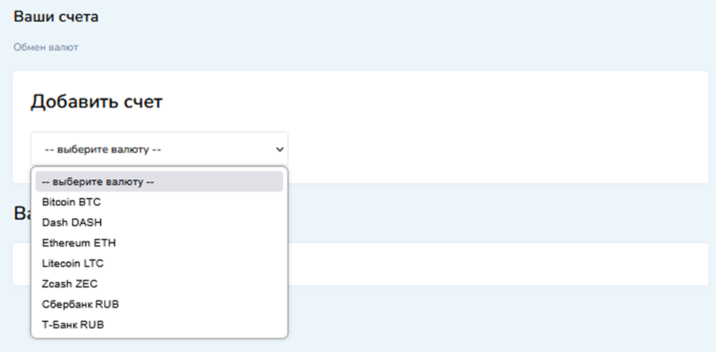 В личном аккаунте также можно добавить собственные счета. Достаточно выбрать тип валюты и ввести адрес кошелька или номер карты. В дальнейшем это должно сократить время на оформление заявки.