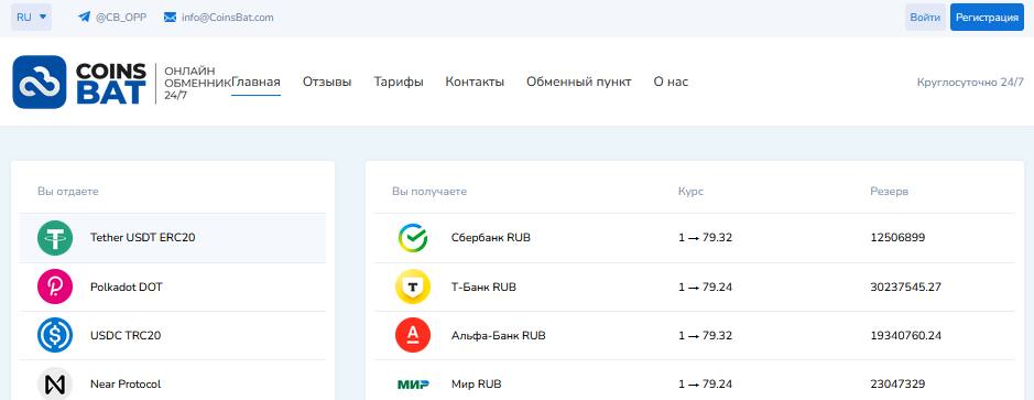 CoinsBat Com – обменный пункт, работающий с цифровыми и фиатными валютами. Потенциальным клиентам предлагают выгодные курсы и оперативную конвертацию онлайн. Есть возможность получения средств наличными через пункт выдачи в Москве.