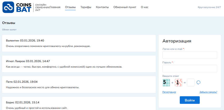 На сайте Coinsbat com отзывы есть. Все опубликованные комментарии положительные. Они говорят о быстроте и надежности обменника.