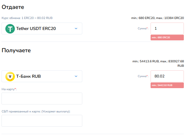Для совершения операции по обмену надо выбрать пару, заполнить поля в форме. Над каждой суммой сразу отображаются актуальные курсы и лимиты. Для вывода на банковскую карту рекомендуется привязка СБП, что сокращает время на проведение транзакции.