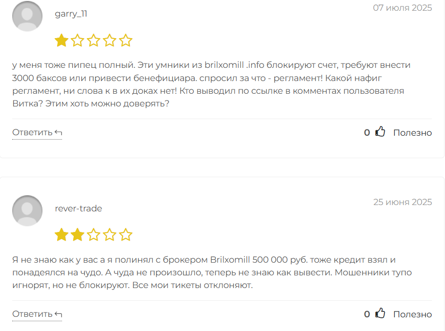 Многие теряли здесь крупные суммы денег: аферисты даже побуждали некоторых клиентов брать кредит, чтобы участвовать в выгодной сделке. Деньги мешают вывести под разными вымышленными причинами: дополнительные комиссии, налоги штрафы. Иногда просят крупную сумму для подтверждения личности или бенефициара.