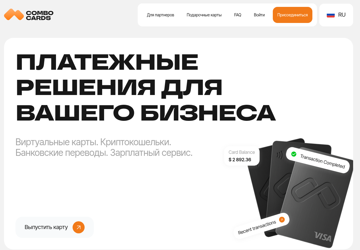Combo Cards (Combocards или Комбо Кардс) предлагает виртуальные банковские карты для предпринимателей и аффилиатов. Сервис акцентирует внимание на оплате рекламы и бизнес-расходов. Работает с 2022 года, предлагает якобы одни из самых низких комиссий на рынке. Создан для команд, но и с вебмастерами-одиночками сотрудничает.