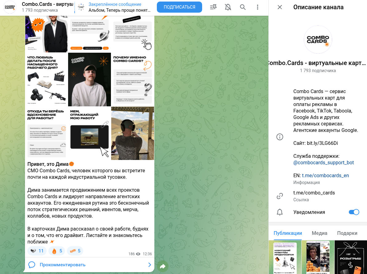 Работает по ссылке @combo_cards с 2023 года. Набрал лишь 1,7 тысячи подписчиков. Но публикации имеют по 400-500 просмотров, поэтому часть аудитории либо уже «вымерла», либо это боты.