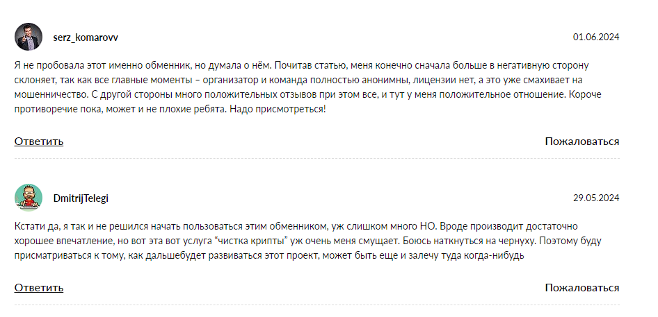 - Негативные комментарии, говорят о риске получить грязные деньги после транзакции. Из-за анонимности команды нет никаких гарантий насчет происхождения средств.
