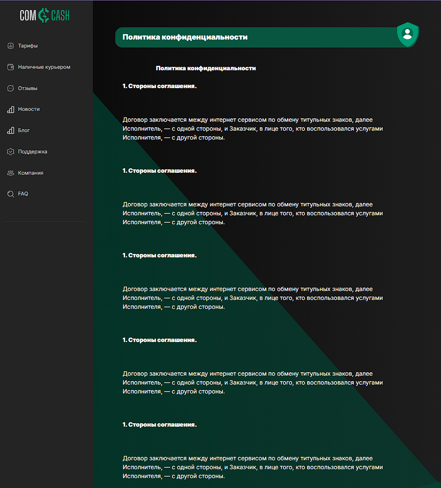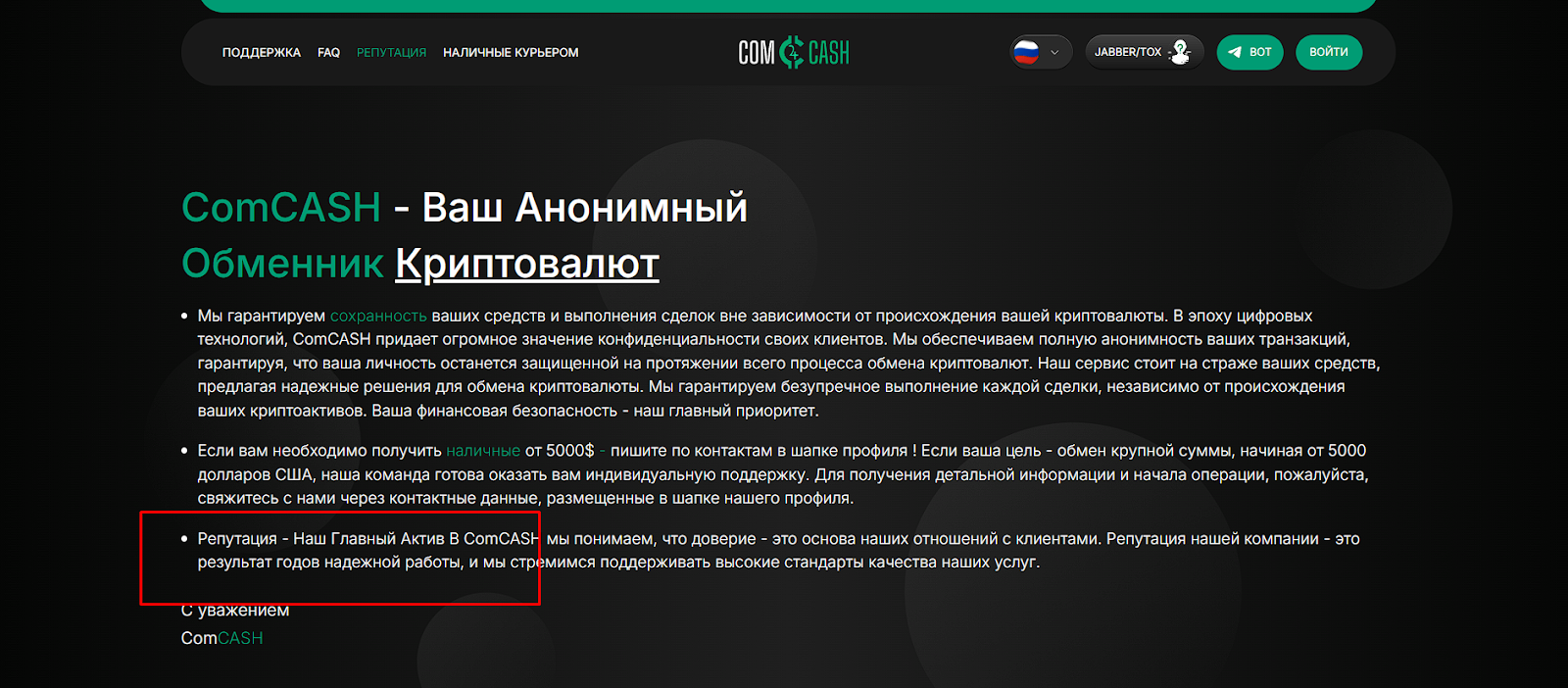 Comcash — анонимный обменник криптовалюты, предлагающий подозрительные услуги “чистка крипты” или “доставка наличных” за 4-6% комиссионных с каждого перевода. Но не будем делать поспешных выводов, давайте проведем полный анализ проекта: от пользовательского соглашения до отзывов. И узнаем, можно ли доверять comcash io или нет?