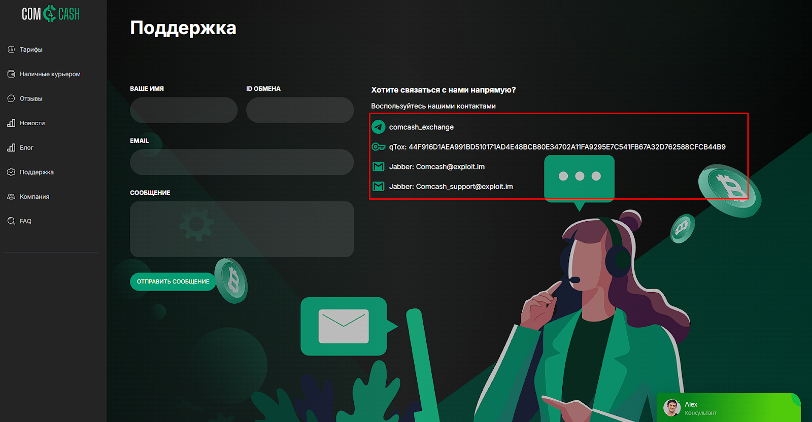 Comcash io это обменник, предлагающий неплохие условия сотрудничества, но не имеющий проверенной репутации или коллектива. Это не удивительно, ведь проект подразумевает полностью анонимную доставку, но это продолжает отталкивать часть пользователей. Для связи указаны адреса двух почт: