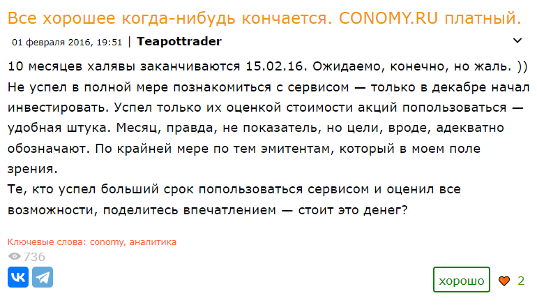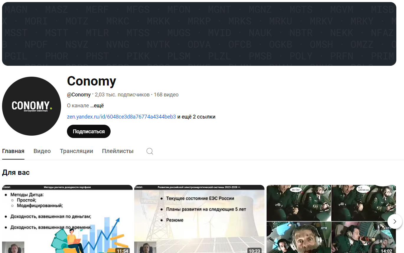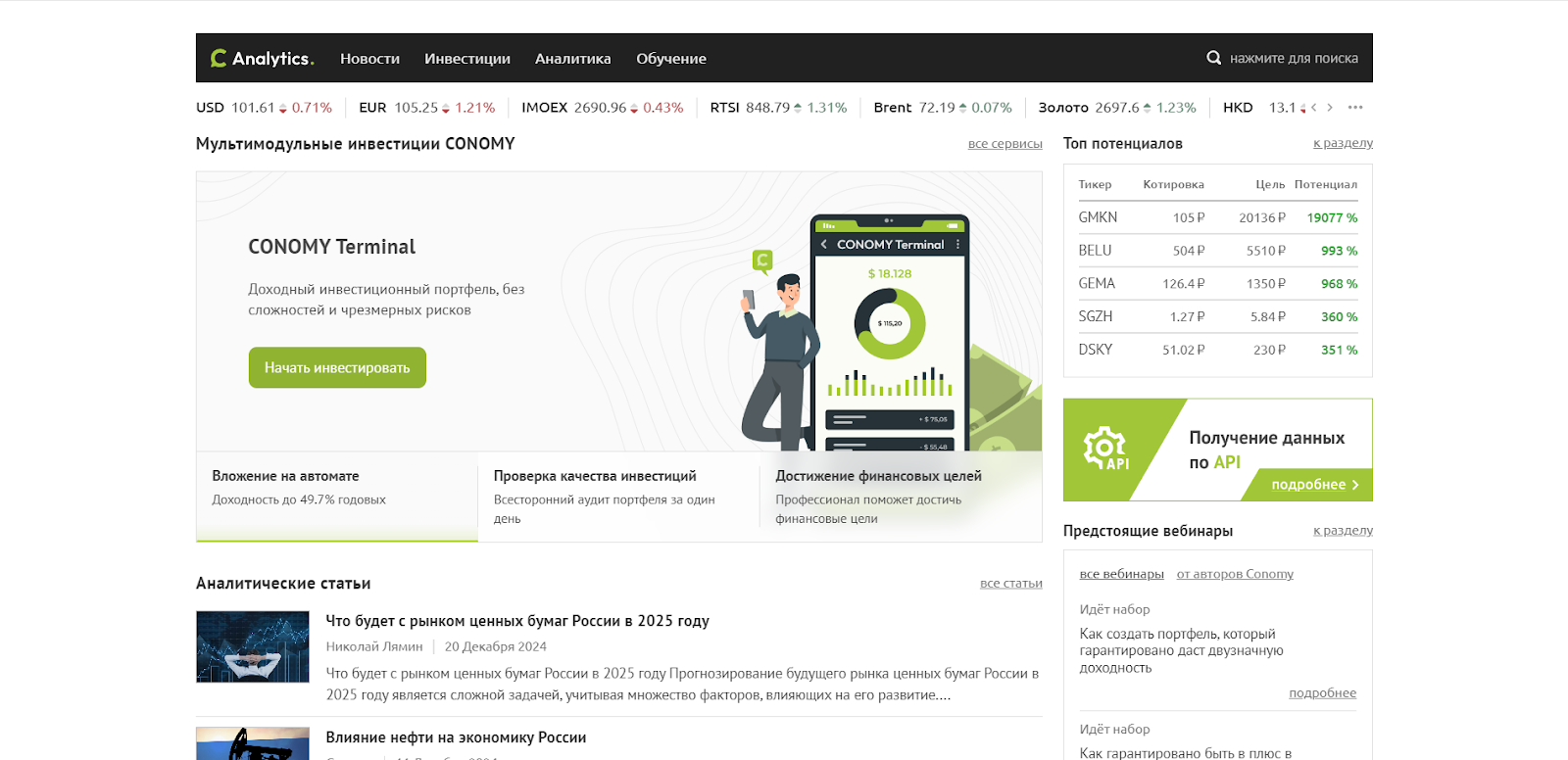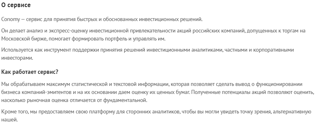 Conomy ru – это сайт, предоставляющий инвестиционные решения. В качестве основы для своей аналитики, используется статистика и данные с Московской биржи. Сервис работает с 2011 года. Основатель: Анатолий Полубояринов.