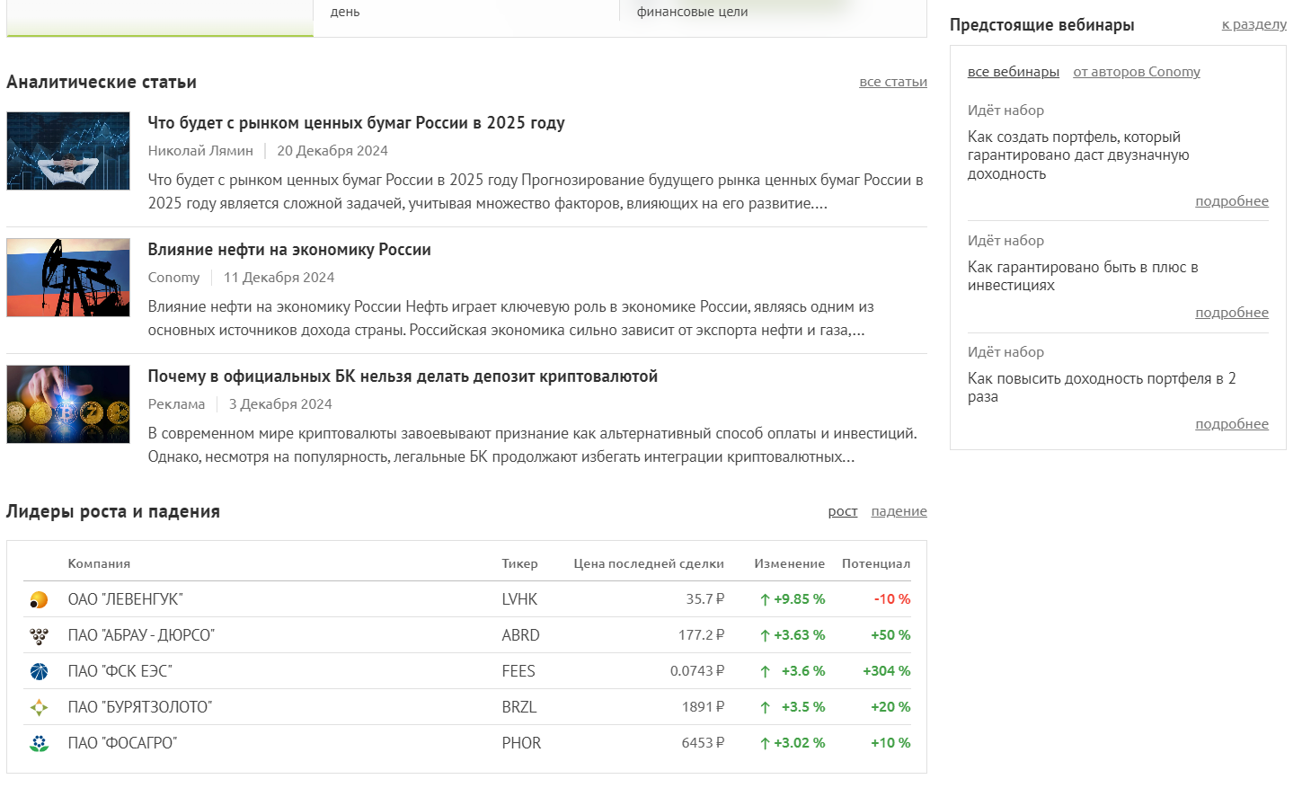 В остальной части сайта: аналитические статьи, график лидеров роста и падения, новости, краткая информация о сервисе и его работе, топ потенциальных тикеров, наборы на вебинары.