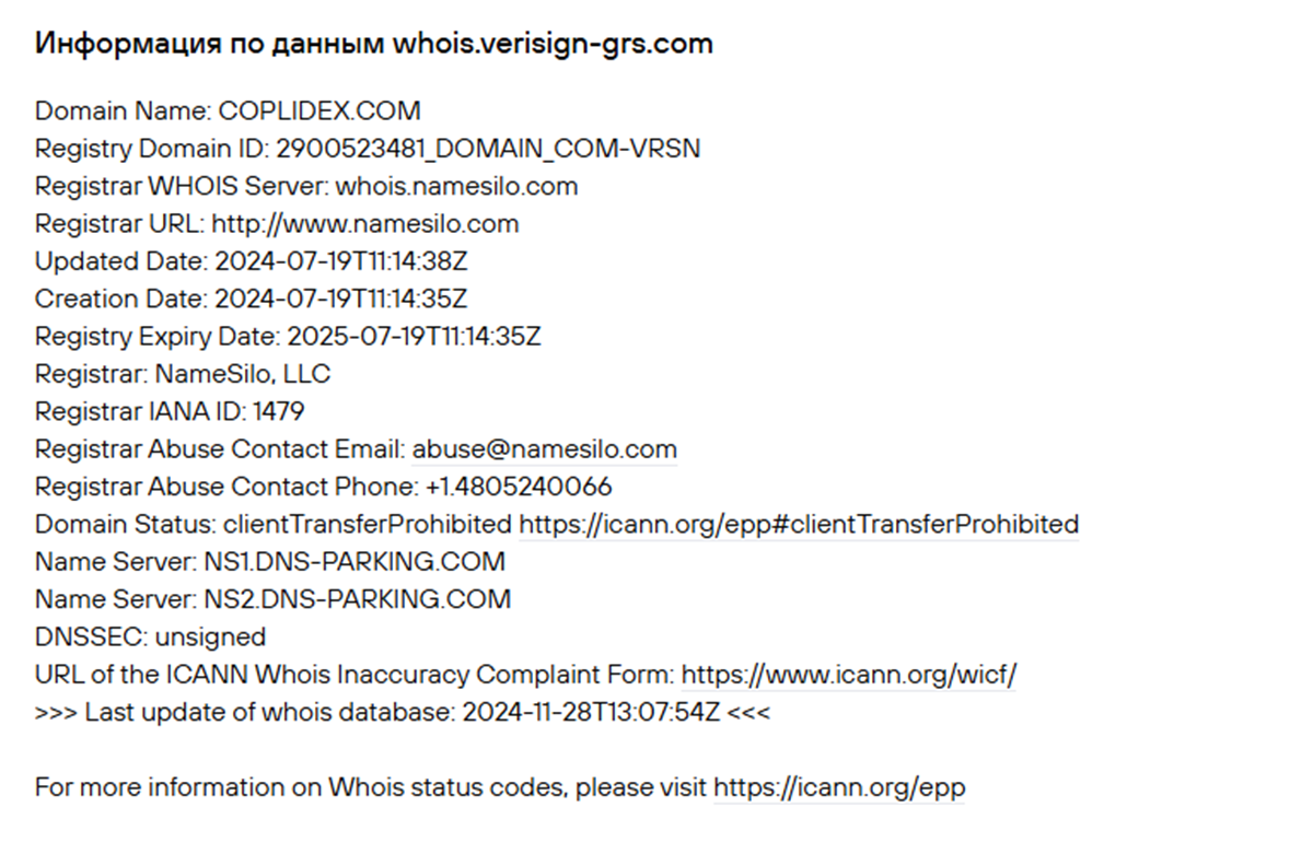 Подтверждает ненадежность кошелька и срок существования доменного имени. Оно было зарегистрировано в июле 2024 года и срок его действия всего год.