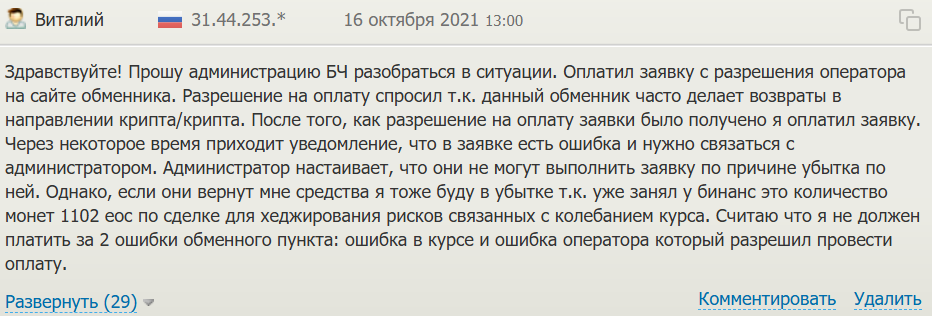 В интернете имеются негативные отзывы о проекте. Один из клиентов описывает, как после успешного получения средств сервис внезапно отменил заявку и вернул деньги только с вычетом собственной комиссии. Это позволяет обменнику перекладывать свои технические проблемы на плечи пользователей.